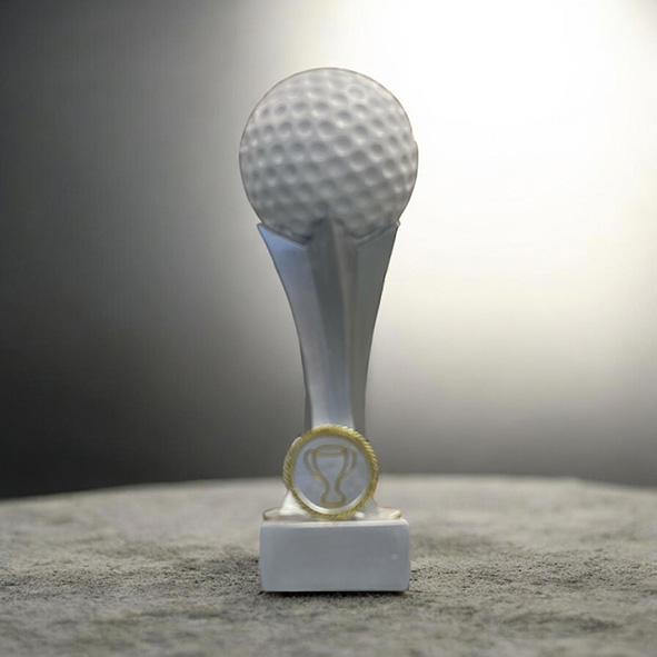 Statyett Golftorn med boll H175mm. Silverfärgad statyett med vita och guldiga detaljer