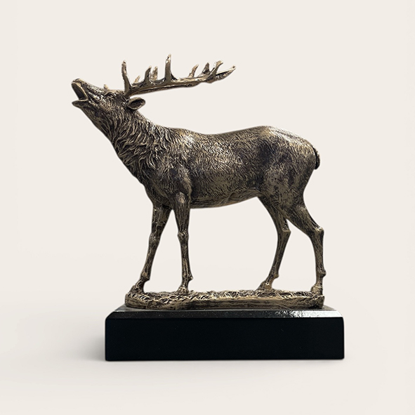 Statyett Hjort 195mm. Bronsfärgad statyett . Svart träsockel/fot