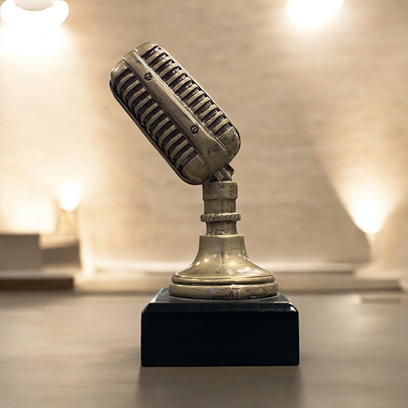 Statyett Mikrofon 170mm. Bronsfärgad statyett i retrostil . Svart träsockel/fot