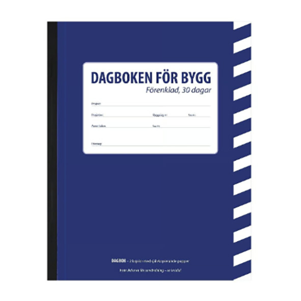 FÖRENKLAD DAGBOK, 30 dgr, kan föras om entreprenör och beställare överenskommit om detta, annars bör fullständig dagbok användas. Förenklad dagbok skrivs i självkopierande rapportset (original + 1 kopia) och ger anvisningar om vilka noteringar som ska föras, t.ex. påbörjade/pågående/färdiga arbeten – avvikelser/störningar/ändringar m.m. Observera att Förenklad Dagbok inte innehåller noteringsunderlag till att föra Arbetsstyrka eller Skyddsrondsprotokoll. A5 format.