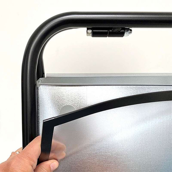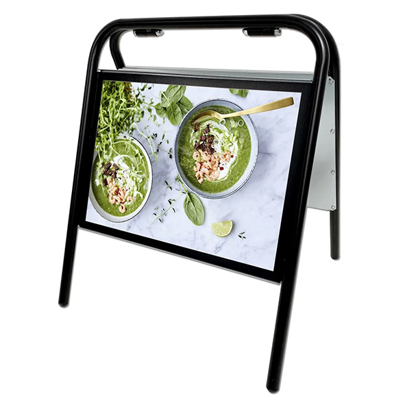 Gatuställ/Mäklarställ i format A3 cm (ark format). Kraftiga svartlackade 25mm rör som gör stället mycket stabilt.
