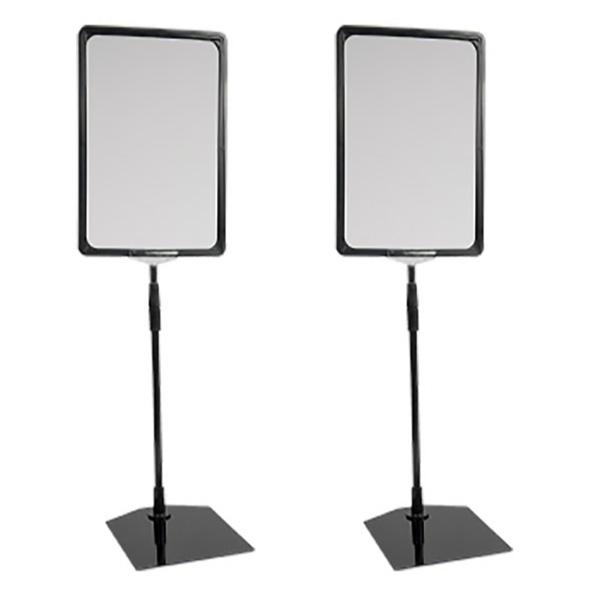 Skyltställ A4 Svart, för bords och golv placering komplett med ram A4, svart teleskopstativ samt svart bordsfot i metall. Stångens längd ihopfällt läge, 35cm. Justerbar upp till 60 cm.
