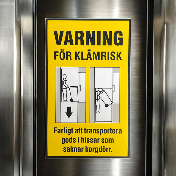 Varning för klämrisk farligt att transportera gods i hissar som saknar korgdörr