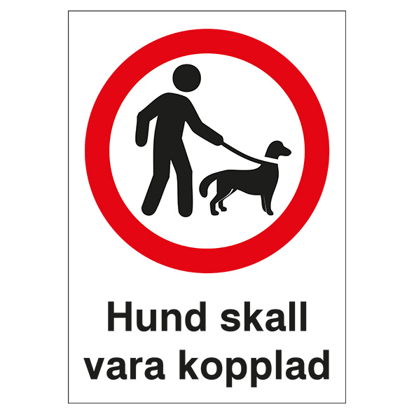 Förbudsskylt hund skall vara kopplad. Skyltarna är tillverkade i 7-årig vinyl för lång hållbarhet. Skyltarna är EJ tryckta, därav ett något högre pris