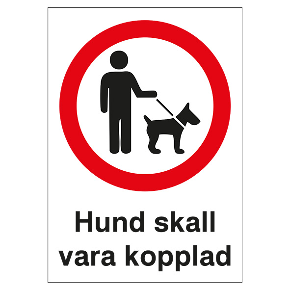 Förbudsskylt hund skall vara kopplad. Skyltarna är tillverkade i 7-årig vinyl för lång hållbarhet. Skyltarna är EJ tryckta, därav ett något högre pris