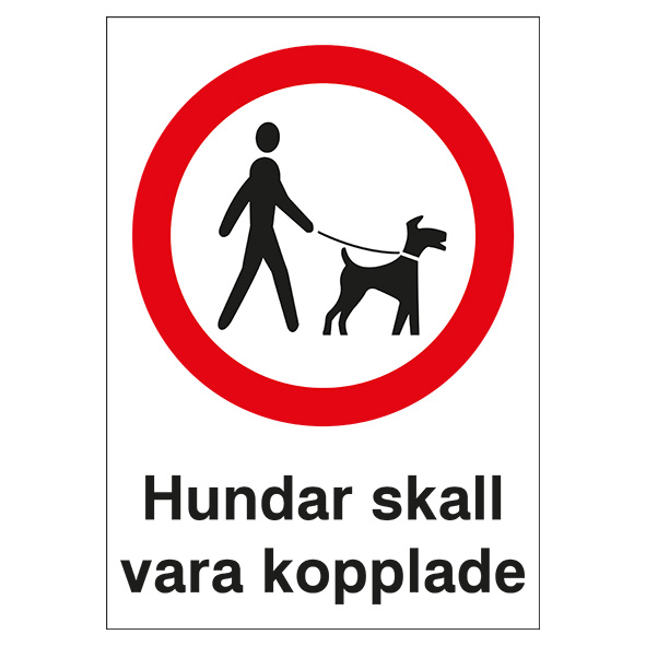 Förbudsskylt hundar skall vara kopplade. Skyltarna är tillverkade i 7-årig vinyl för lång hållbarhet. Skyltarna är EJ tryckta, därav ett något högre pris