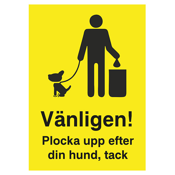 Förbudsskylt Vänligen plocka upp efter din hund tack. Skyltarna är tillverkade i 7-årig vinyl för lång hållbarhet. Skyltarna är EJ tryckta, därav ett något högre pris