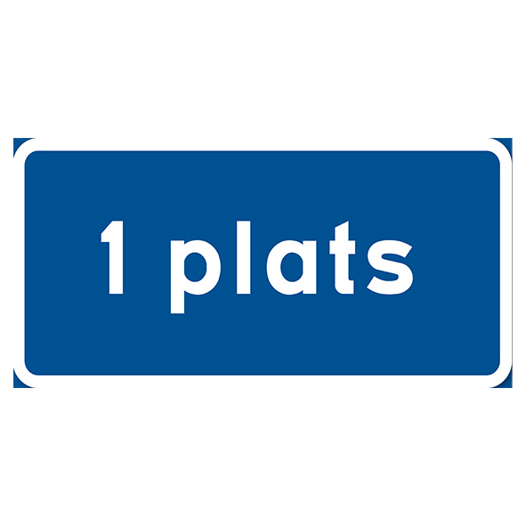 Parkeringsskylt Vägskylt 1 plats. Skyltens mått är antingen 400x200mm eller 480x225mm. Kan beställas både som bockad i över och underkant för montering på stolpe, och som plan plåt eller plastskylt.