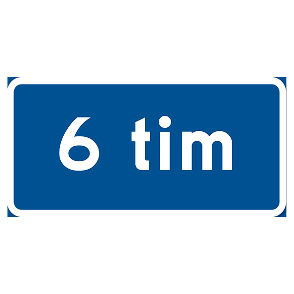 Parkeringsskylt / Vägskylt 6 timmar. Skyltens mått är antingen 400x200mm eller 480x225mm. Kan beställas både som bockad i över och underkant för montering på stolpe, och som plan plåt eller plastskylt.