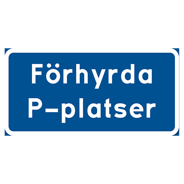 Parkeringsskylt Vägskylt Förhyrda P-platser. Skyltens mått är antingen 400x200mm eller 480x225mm. Kan beställas både som bockad i över och underkant för montering på stolpe, och som plan plåt eller plastskylt.