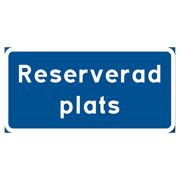 Parkeringsskylt Vägskylt Reserverad plats. Skyltens mått är antingen 400x200mm eller 480x225mm. Kan beställas både som bockad i över och underkant för montering på stolpe, och som plan plåt eller plastskylt.