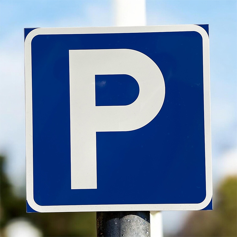Parkeringsskylt P. Kan fås i bockad plåt, plan plåt eller plast. Finns även i olika storlekar