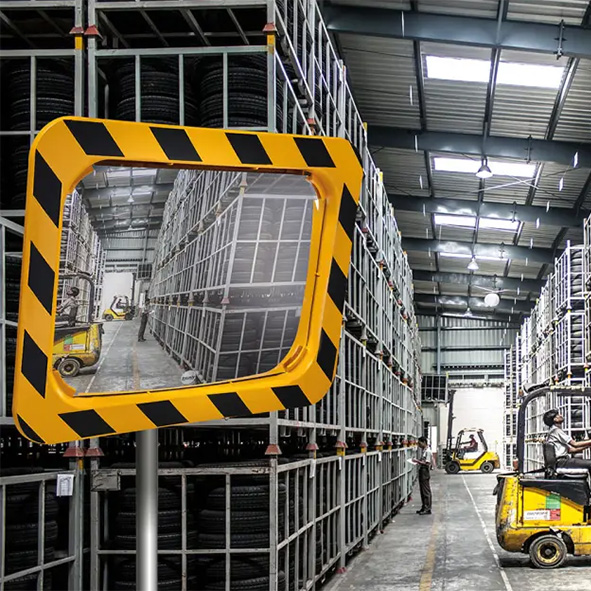 VIALUX®-speglar med gula och svarta ramar syns lätt i industriella miljöer där dessa färger är normen. Avsedda att säkra cirkulationen inom industriområden för att undvika kollisioner i döda vinklar.